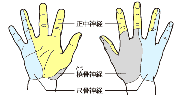 たとえば、正中神経や尺骨神経には交感神経線維が多く含まれているため、前腕部の冷感はよくある訴え。