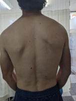 1:外見上の異常…片方の背部や腰部の突出や肩の高さの左右差、ウエストラインの左右非対称性、肋骨の突出、乳房の形の左右差、円背や凹背など